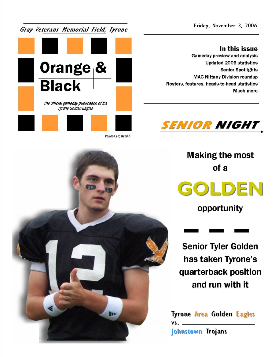 By then, Tyrone had been a regional powerhouse for more than a decade. The Golden Eagles had played in two state championships, winning one of them in 1999, and gone to the PIAA Final Four on four occasions. These were good times. Friday night at Gray-Veterans Memorial Field was a party, and everyone was going. Big games on the road often drew larger crowds of Tyrone fans than the home-standers. Tyrone football was something young boys wanted to be a part of, often dreaming of the day they would don that black jersey, strap up the white helmet with the orange “T”, and if they were lucky apply the eye black smeared like war paint when the playoffs rolled around.