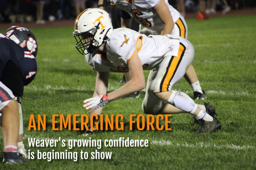 Until then, Weaver had always been a skill player, and his combination of speed and agility made him a pretty good one at every level right up to varsity, but with the Golden Eagles’ already floundering line depleted by injuries the team needed somebody who could hold a block.