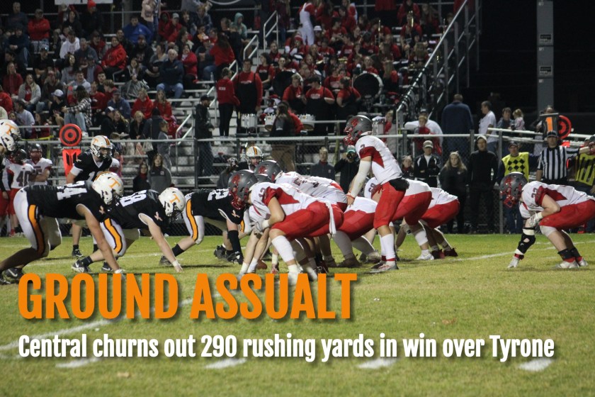In response, Central didn’t immediately turn to Hoenstine’s arm, instead opting to take what was given and hand the ball to the 6-foot-2, 210-pound Smith, who chugged for 25 yards to Tyrone’s 42 on the first play following the kick.