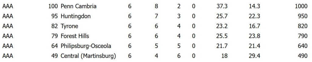 The Eagles finished the month 3-1, losing only to top-seeded Penn Cambria. Their 28-7 win over Philipsburg-Osceola last week had solidified at least the fourth position, but their victory over the Lions, combined with Bellwood-Antis’s 45-27 win over Forest Hills, allowed Tyrone to jump ahead of the Rangers.